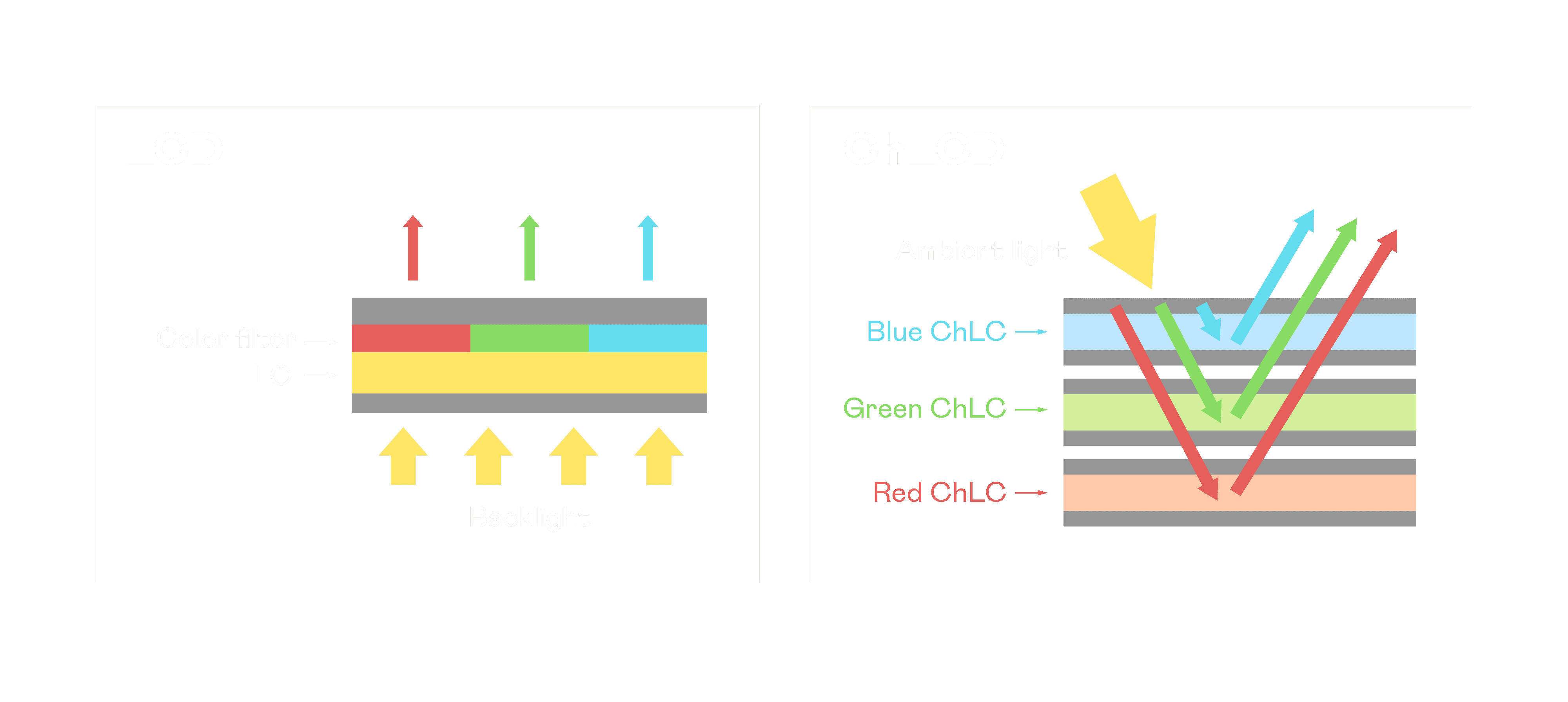 ChLCD 胆固醇液晶就如同纸张一样,,,透过反射环境光来显示影像,,因此长时间观看不易造成人眼视觉疲劳,,可达到护眼效果。。。。当处于户外阳光下使用,,LCD 影像容易失真而不易观看,,但胆固醇液晶仍可维持较佳的影像品质。。