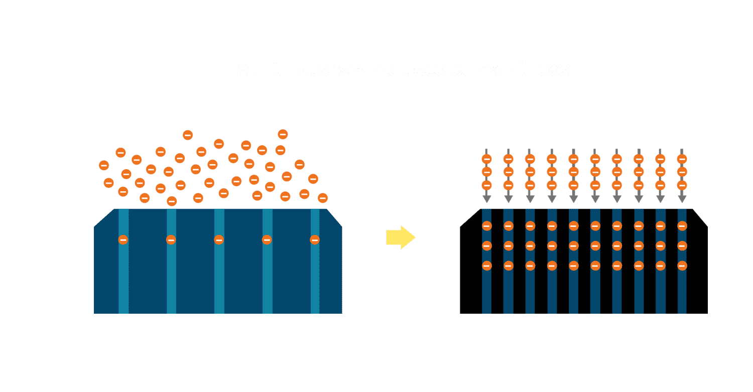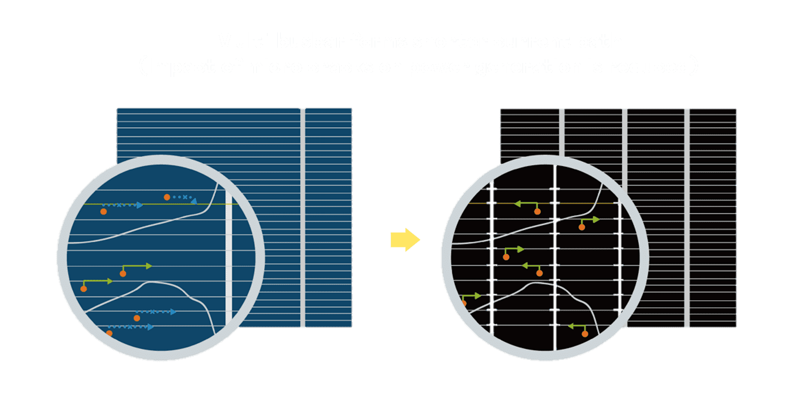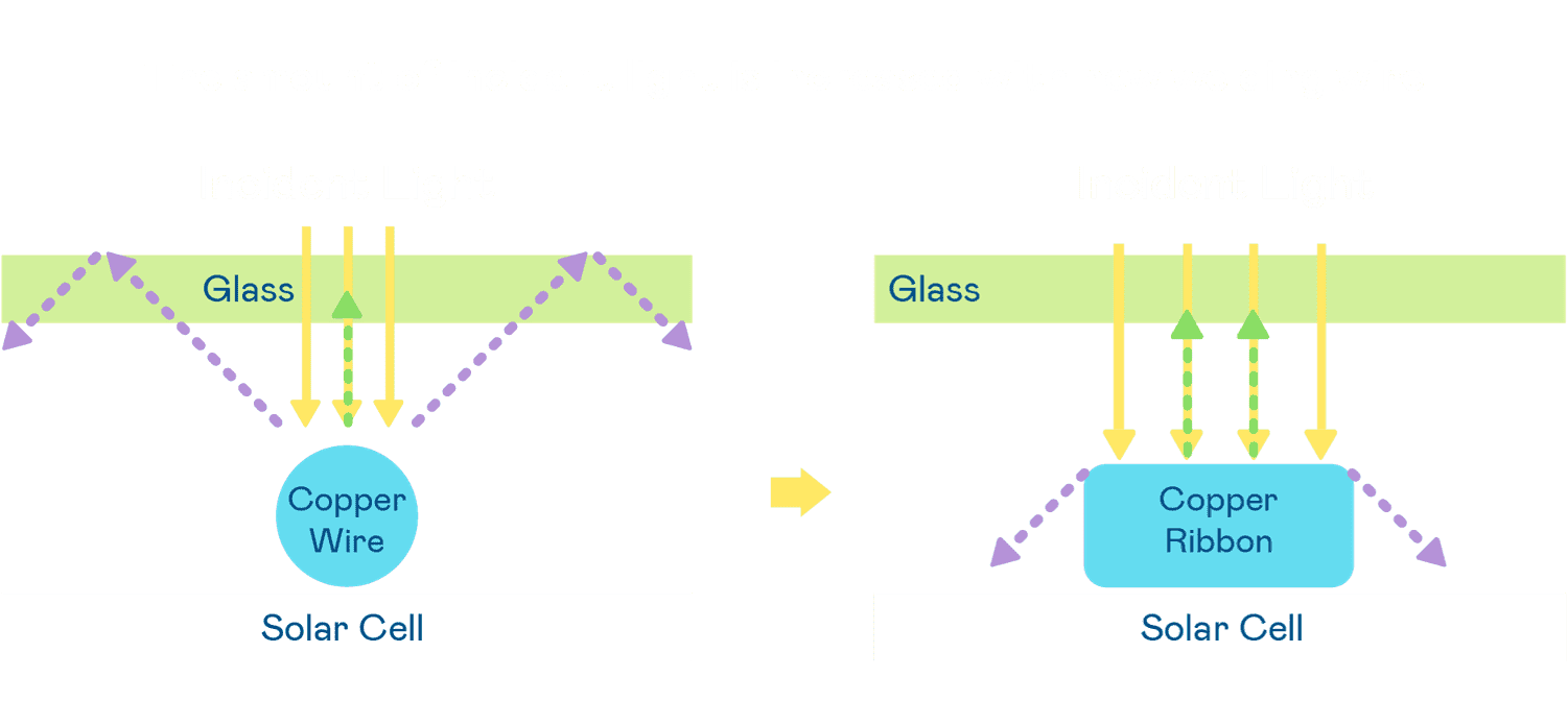 - 电池使用多条铜导线 (Copper wire) 于电池片上形成较短的电流路径,,,,提高电流收集效率,,,采用圆形设计的铜导线较传统扁平式的铜焊带 (Ribbon),,,,可增加入射至电池的光线量。。。。