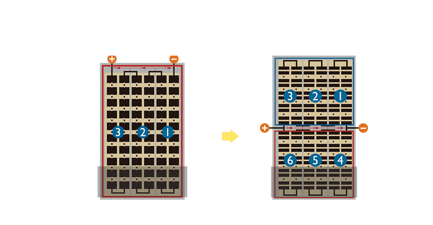 - 结合半切电池,,,,降低遮阴影响、、提升模组抗隐裂能力、、并减少电阻损耗,,,进一步提升模组发电效能。。。。